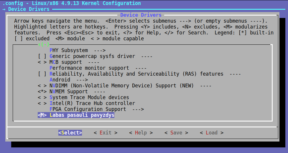 Na dabar jau galime bandyti kompiliuoti: sugrįžtame į kernelio kodo šakninį aplanką ir paleidžiame make menuconfig, įeiname į Device Drivers ir štai - matosi mūsų modulis: