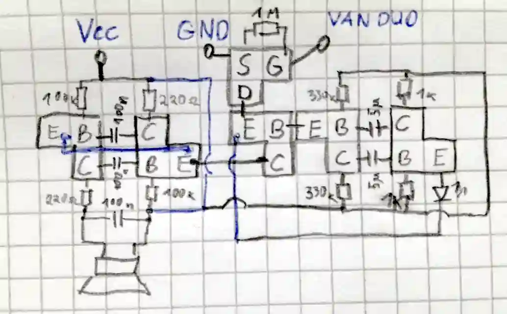 Klausimas, ką daryti, kai tas vanduo yra aptinkamas? Ar mirksėti ar pypsėti ar per WiFi išsiųsti kokį nors pranešimą? Pasirinkau pypsėjimą, nes mirksėti po vonia nėra prasmės - vis tiek niekas nematys, o su WiFi žaisti nenoriu. Pypsėjimui sukurti panaudosiu du multivibratorius - vienas generuos cypimą, o kitas - tą cypimą įjungs ir sustabdys kas pusę sekundės ir taip gausis pypsintis cypsėjimas.